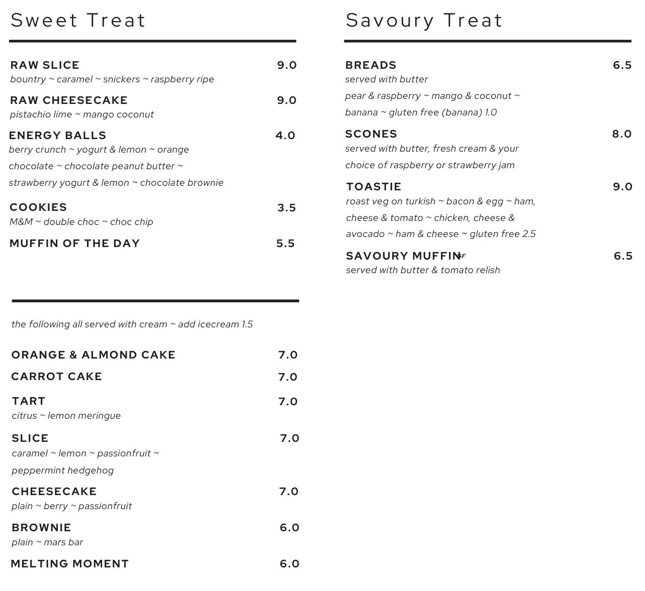 Sweet and Savoury Our sweet and savoury menu is served all day long and available for dine in and takeaway.